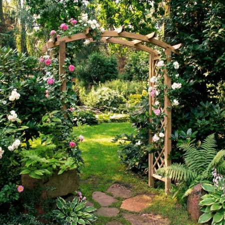 - The Arcade Garden Arch echoes the rounded arcade forms found in Roman architecture. With its tall archway and diagonal trellis side panels, it invites climbing plants to shape its silhouette over time.
