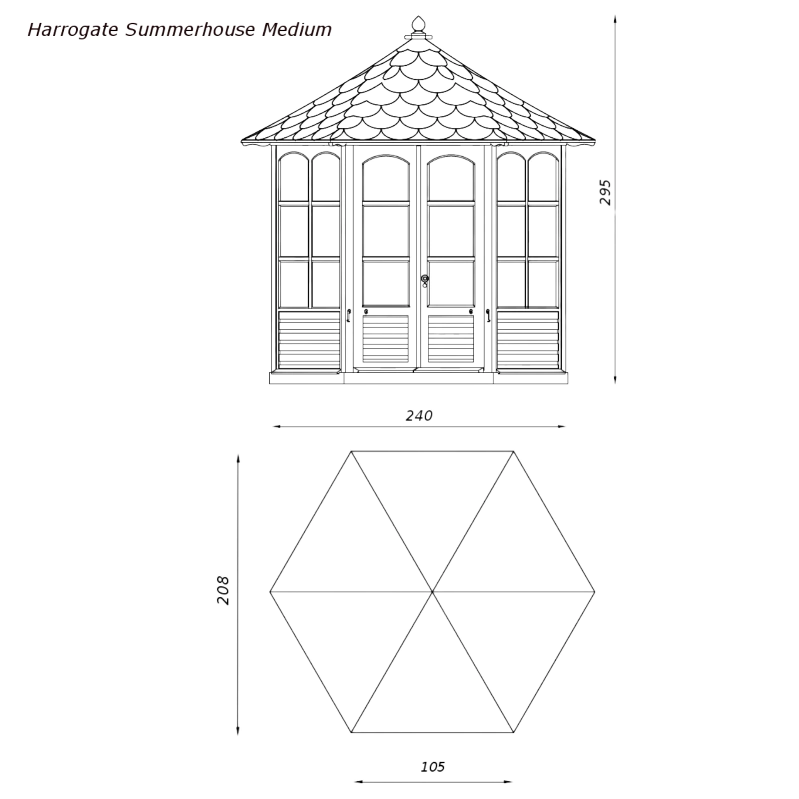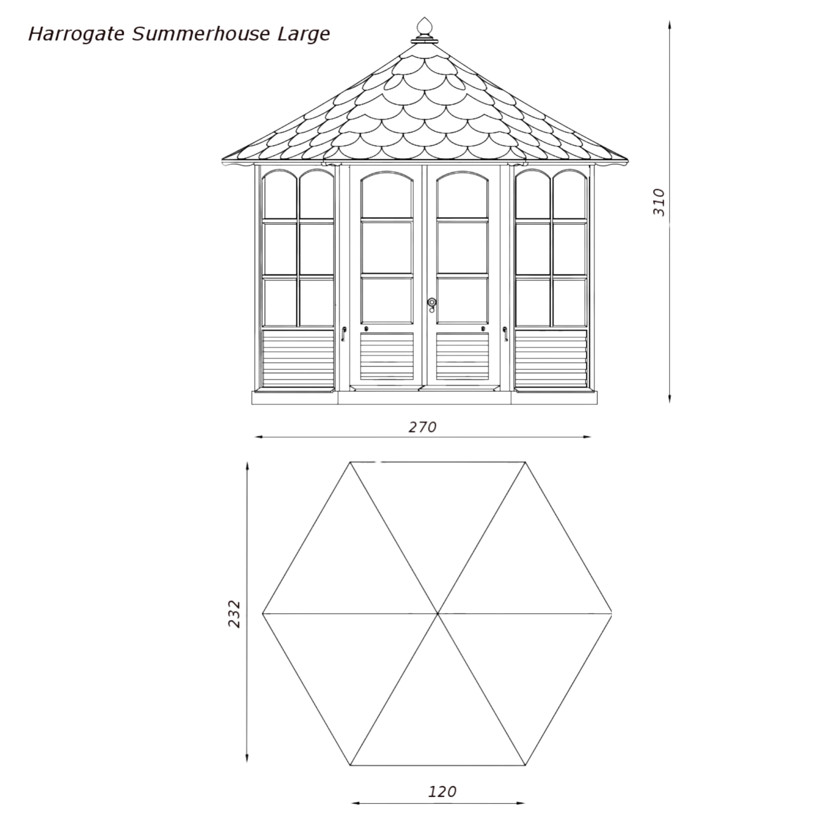 This hexagonal summerhouse has 4mm toughened glass glazing in the windows and doors. British made Brass door fixings are also incuded as standard. This traditional wooden summerhouse is delivered flat pack with instructions for self assembly. The floor and benches can be purchased as an optional extra. The Harrogate Summerhouse is available in two sizes.