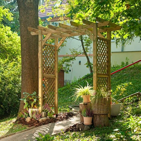 • The Henley Garden Arch is wider than most garden arches within our range and can be used to create a stunning focal point within your garden. The trellis side panels allow climbing plants such as Clematis or Roses to grow up and around this wooden arch.
